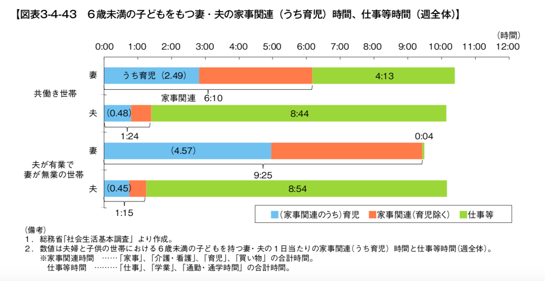 このグラフは核家族夫婦の家事・育児時間を表したものです。さすがにPTA活動の時間という項目はありませんが(笑)、共働きであっても、専業主婦の家庭であっても、男性の家事関連時間はほとんど変わらないというデータが出ています。